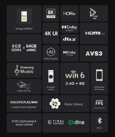 *Supports AV1/VP9/H.265/AVS3/AVS2 video codecs, 12-bit, BT.2020 wide color range; supports Atmos/DTS X audio pass-through output.